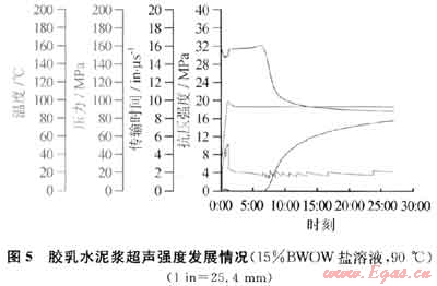 據(jù)本文參考文獻(xiàn)[5]報(bào)道,鹽摻量大于10%時(shí)以上時(shí)會造成水泥石早期強(qiáng)度損失,其強(qiáng)度明顯下降。因此,必須考慮含鹽膠乳水泥漿的強(qiáng)度發(fā)展情況。耐鹽膠乳水泥漿在90℃下的超聲強(qiáng)度發(fā)展眙線如圖5所示。從圖5可以看出,膠乳水泥石24h抗壓強(qiáng)度大于14MPa。
