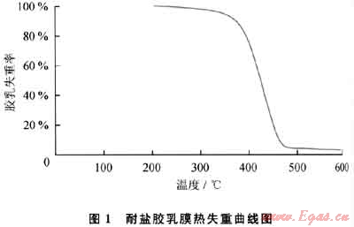 此外,為保證耐鹽膠乳在水泥石中發(fā)揮作用,保證膠乳具有較好的熱穩(wěn)定性是必要的。耐鹽膠乳的熱失重曲線如圖1所示,從圖1可以看出,膠乳在250℃下沒有明顯降解。表明耐鹽膠乳的理論使用溫度為200℃(BHCT)。結(jié)合DSC測試結(jié)果,表明耐鹽膠乳理論適用溫度范圍為-18~200℃。