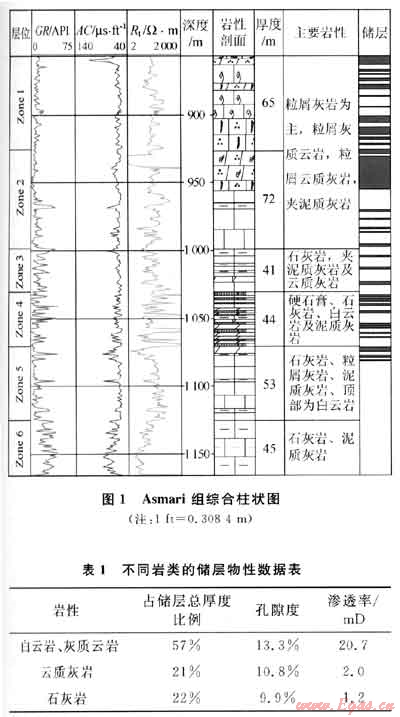 根據(jù)測(cè)井解釋(表1),白云巖類(lèi)儲(chǔ)層所占比例高,孔隙度、滲透率高,物性好,是主要的儲(chǔ)集巖類(lèi),這與MIS構(gòu)造Asmari組主要為石灰?guī)r儲(chǔ)層的傳統(tǒng)認(rèn)識(shí)有差別[1]。
