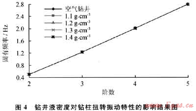 考慮空氣鉆井和不同鉆井液密度情況下的鉆柱扭轉(zhuǎn)振動,計算結(jié)果如圖4所示。從圖4可看出,伴隨鉆井液密度變化,鉆柱扭轉(zhuǎn)振動的固有頻率保持不變。