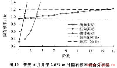 空氣鉆井中,鉆柱在井下運動時,可能是一種或幾種振動情況同時存在,因此考慮將振動進行耦合分析顯得更加重要。針對普光A井2827m時的情況,將3種振動耦合在一起考慮,結(jié)果如圖10所示。
