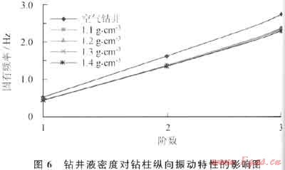 考慮鉆井液對鉆柱縱向振動影響,計算結(jié)果如圖6所示。由圖6可見,有鉆井液時,縱向振動的固有頻率比無鉆井液時頻率低很多。分析發(fā)現(xiàn),鉆井液密度為1.1g/cm3時,第1~3階固有頻率比無鉆井液時降低了18%左右且鉆井液密度越高,鉆柱的固有頻率越低。