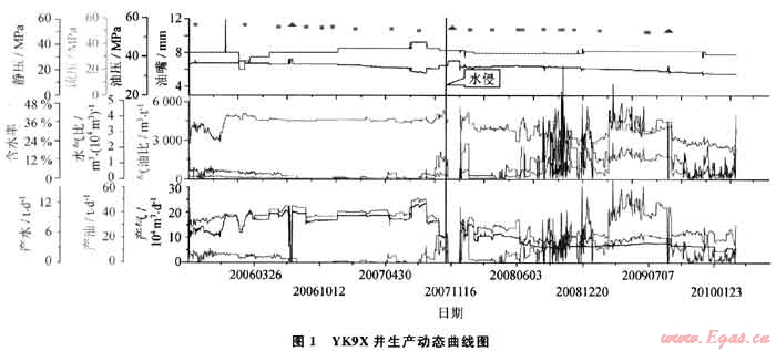 水侵導(dǎo)致氣油比下降的機(jī)理為:當(dāng)壓力低于露點(diǎn)壓力后,凝析油析出,吸附于巖石的表面形成油膜,而巖石是親水的,當(dāng)邊水入侵后,地層水會(huì)填充角隅和微小孔隙,這樣一方面可以使吸附、滯留于巖石表面的凝析油發(fā)生流動(dòng);另一方面邊水的入侵使氣相的滲透率大幅度減小,阻礙氣相的流動(dòng),這樣就造成了部分氣井產(chǎn)氣量驟降,而產(chǎn)油量變化不大,氣油比減小的情況。
