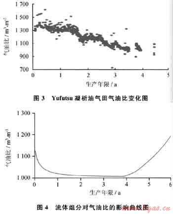 某些凝析氣藏在形成時(shí),由于自然對流和熱擴(kuò)散的作用[5],導(dǎo)致流體重組分含量隨深度的增加而減小,即氣藏頂部的流體最重,隨深度的增加,重組分含量逐漸減小,如日本的Yufutsu凝析油氣田。該氣田部分直井選擇在儲(chǔ)層的下部進(jìn)行射孔,這就造成剛開始生產(chǎn)時(shí)的流體較輕,氣油比較高,而隨著開采的繼續(xù),將采出更多的淺層較重的凝析氣,這就造成生產(chǎn)氣油比的下降(圖3)。