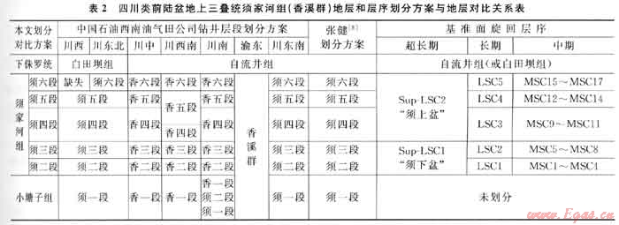 由于控制四川盆地構造-沉積格局的龍門山和米倉山-大巴山兩條造山帶逆沖推覆活動的非同步性和異方位性[5~6],須家河期的沉積充填作用于盆地各部位也是不同步和非均衡的,在地層表現(xiàn)形式上,如地層厚度、巖性、巖相、疊置方式和物源供給方向都存在很大的差異性,致使盆地范圍內須家河組很難進行統(tǒng)一地層劃分和區(qū)域對比。但依據(jù)上述各次級構造單元須家河組層序發(fā)育特征,筆者采用高分辨率層序地層學理論和層序分析與對比技術[19],從盆-山耦合過程的構造-沉積序列分析和旋回等時對比法則入手,在對各次級構造單元須家河組進行層序劃分和發(fā)育特征描述的基礎上,建立貫穿盆地的層序 地層和時間-地層格架,從層序演化規(guī)律和旋回等時性分析角度出發(fā),對須家河組進行了更為合理的統(tǒng)一劃分和區(qū)域地層對比取得較好效果(表2),也為編制須家河組更精細的層序-巖相古地理圖[16]和描述層序充填樣式與氣藏分布關系[20]提供了更為有效的基礎資料。