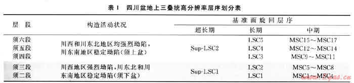 按照地層基準面旋回級次劃分和命名原則[3],同時考慮層序界面性質、發(fā)育規(guī)模、結構類型和地層疊加樣式,對盆內200余口井和10余條地表剖面的須家河組進行了高分辨率層序分析,可以劃分出兩個分別代表“須下盆”和“須上盆”成盆期的、與構造層序(或三級層序組)相當?shù)某L期旋回層序(Sup-LSC1~SupLSC2,以下簡稱為構造層序),5個對應于各巖性段的與三級層序相當?shù)拈L期旋回層序(LSC1~LSC5),以及17個中期旋回層序(MSC1~MSC17)(表1),其中超長期和長期旋回層序于盆地范圍內具有很好的區(qū)域可對比性[9~10]。