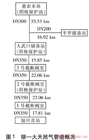 石嘴山市天然氣工程管道(簡稱銀-大天然氣管道)起點為銀川的銀川首站,在大武口區(qū)和平羅縣分別設分輸站,末站設在惠農區(qū)的煤氣廠。該管道全長150.23km,管道規(guī)格分別為DN 350、300、200mm,設計年輸氣能力為6×108m3/a。該管道距離較長,采用強制電流陰極保護。銀-大天然氣工程管道概況見圖1。