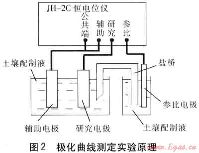 管道的致鈍電流密度、維鈍電流密度、穩(wěn)定鈍化區(qū)電位范圍的測定方法采用恒電位法[4]。恒電位法就是將研究電極依次恒定在不同的值,然后測量對應(yīng)于各電位下的電流。極化曲線的測量應(yīng)盡可能接近體系穩(wěn)態(tài)。體系穩(wěn)態(tài)指被研究體系的極化電流、電極電位、電極表面狀態(tài)等基本上不隨時間而改變。在實(shí)際測量中,常用的控制電位測量方法有動態(tài)法,控制電極電位以較慢的速度連續(xù)地改變(掃描),并測量對應(yīng)電位下的瞬時電流,以瞬時電流與對應(yīng)的電極電位作圖,便獲得整個極化曲線。測量在實(shí)驗(yàn)室進(jìn)行,需要恒電位儀1臺,飽和甘汞電極1支,Q235A鋼制作的電極1支,鉑電極1支,三室電解槽1只,2L現(xiàn)場土壤配制液,0.5mol/L的H2S04溶液2L,0.85mol/L的丙酮水溶液1.5L。用金相砂紙將Q235A鋼制作的測試電極打磨至鏡面光亮,用石蠟蠟封,留出1cm2面積,然后在丙酮水溶液中除油,在0.5mol/L的H2S04溶液中去除氧化層,浸泡時間分別不低于10s,然后按圖2進(jìn)行安裝。圖2中,選用JH-2c恒電位儀作為恒電位的輸出,參比電極選用飽和甘汞電極,輔助電極選用鉑電極,研究電極為Q235A鋼制作的測試電極。保持25℃環(huán)境,測量方法采用動態(tài)法。