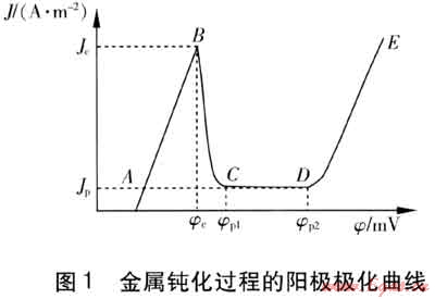 圖1為典型的鈍性金屬鈍化過程的陽極極化曲線。圖1中,橫坐標(biāo)表示陽極極化電位φ(單位為mV),縱坐標(biāo)表示電流密度1,(單位為A/m2),AB段金屬發(fā)生活性溶解,稱為活化區(qū),在A點(diǎn),金屬為自然腐蝕狀態(tài),在靠近曰點(diǎn)附近,電極極化過程受到阻礙,可能產(chǎn)生氧化物的薄膜;在BC段,保護(hù)膜的生長速度已超過化學(xué)溶解速度,形成保護(hù)膜,這一區(qū)稱為鈍化過渡區(qū),到C點(diǎn)時,整個表面已被吸附氧化膜所覆蓋;在CD段,陽極電流與電位往往沒有關(guān)系,這一區(qū)為穩(wěn)定狀態(tài),稱為穩(wěn)定鈍化區(qū)。隨著電位的升高,膜中氧的含量增加,膜隨之變厚;在DE段,D點(diǎn)的電位相當(dāng)于氧的陽極析出電位,氧化膜被氧化成可溶性的高價氧化物,金屬又開始溶解,這一區(qū)域稱為過鈍化區(qū)。