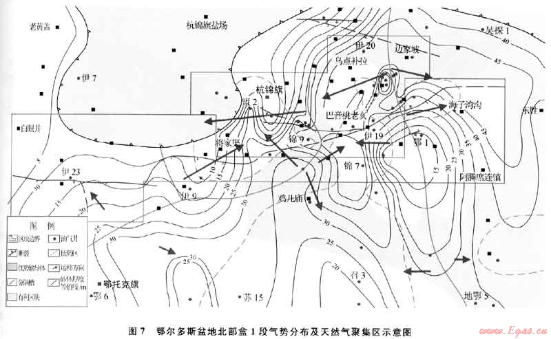 常規(guī)油氣圈閉機制是在儲層中有被油氣高等勢面封閉形成的油氣低勢區(qū),這種低勢區(qū)是一個孔隙、滲透性巖體,是聚集、保存油氣的場所,位置具有明顯的可預(yù)測性。這說明,常規(guī)油氣的聚集取決于油氣勢的太小,高部位一般具有低油氣勢,是油氣運移的指向,目此,常規(guī)油氣主要聚集于背斜構(gòu)造。常規(guī)天然氣在運移過程中主要受浮力、毛細管力和地層水的水動力3種作用力的共同控制。天然氣在地層中不同位置的勢能不同,由于氣勢梯度的存在,天然氣會沿著氣勢減』、的最大方向(負氣勢梯度方向)從高氣勢區(qū)向低氣勢區(qū)運移(圖6)。運移的結(jié)果是天然氣進入自身勢能最1、的區(qū)域后不再發(fā)生運移,達到平衡狀態(tài)后聚集成藏。如通過對鄂爾多斯盆地北部二疊系石盒子組盒1段氣勢的分析發(fā)現(xiàn),天然氣聚集區(qū)主要發(fā)育于低氣勢區(qū)(圖7)。