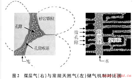 常規(guī)天然氣儲層主要發(fā)育于烴源巖圍巖中,具有明顯的生儲蓋縱向組合,而煤層氣的儲層就是煤層本身,從而造就了兩者在儲集機理和氣藏特征上的差異。