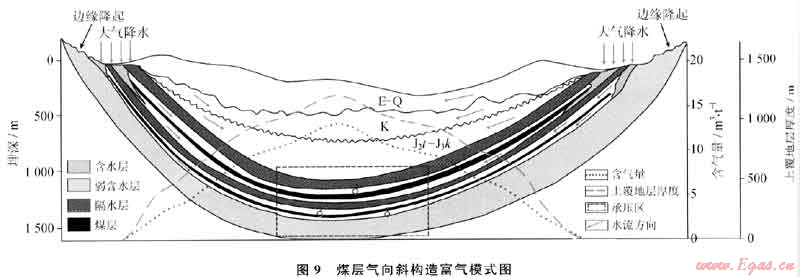 通過對國內(nèi)外煤層氣富集規(guī)律的研究,發(fā)現(xiàn)了自斜構(gòu)造富集煤層氣這一普遍特點,如美國圣湖安盆地、我國沁水盆地等都可見到這一現(xiàn)象[41~43](圖8)。煤層氣向斜富集規(guī)律并非偶然,取決于煤層氣特殊的賦存方式。由于煤層氣的賦存絕大部分是吸附氣,煤吸附煤層氣屬于物理吸附,從Langmuir等溫吸附方程可知,煤的吸附量隨壓力增大而增大。因此,要保持煤層中有足夠大的吸附量,低水勢和高壓力是主要的前提條件。向斜軸部位于地層下傾部位,地層水位低,使煤層處于承壓水環(huán)境,壓力得到保存;另一方面,向斜軸部一般位于盆地深部,靜水壓力較大,具有較高的地層壓力。因此,由于水勢和壓力的共同作用,使向斜軸部不僅可以保持較高的壓力條件滿足煤層的最大吸附,而且大氣滲入水體在軸部形成向心流,也能起到水封的效果,對煤層氣的保存有利,在向斜部位更容易吸附煤層氣而富集成藏。