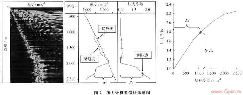 目前地層壓力預測的方法較多,但大多數(shù)都屬于經(jīng)驗公式的方法,受到一定的適用條件的限制。地層速度是用于地層壓力鉆前預測和鉆后壓力計算的主要參數(shù),層速度特點是在正常壓實的地層中其值隨深度的增大而增大,而在異常超壓地層中其值比正常值小,因此可憑借層速度的異常變化來判斷和檢測異常高壓地層[7~1O]。經(jīng)過多年對鶯歌海盆地壓力預測及計算方法研究,發(fā)現(xiàn)“差值法”(圖2)可以應用于鶯歌海盆地壓力計算,其基本原理是用速度異常量來確定異常壓力。其標準為:△v=0為正常壓實地層;△v<0為異常高壓力地層。該方法需要在地區(qū)性的壓力預測數(shù)學模型的基礎上定量地計算出孔隙壓力,其優(yōu)點是不需要先計算上覆壓力,減少誤差和一些不可控因素。對于這一方法而言,速度差與壓力系數(shù)對應的壓力預測模型的確定是其中的難點和重點。