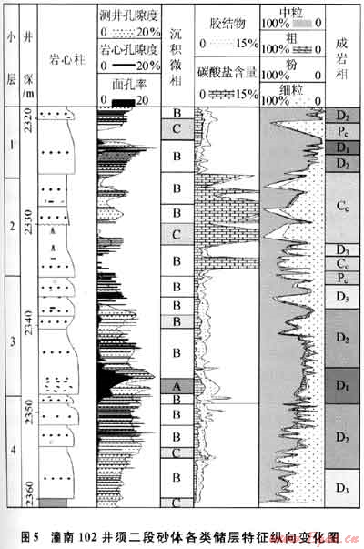 須二段大型復(fù)合砂體主要由4期河道遷移擺動形成的砂體組成,縱向上不同時期沉積砂體之間或同期砂體內(nèi)部的沉積韻律、微相組合、膠結(jié)物類型及其含量、成巖相類型及其組合以及孔隙度和面孔率等存在明顯差異,非均質(zhì)性較強。圖5為潼南102井須二段復(fù)合砂體沉積微相、成巖相和孔隙度的縱向變化圖,可見河道滯留微相(A)和砂壩相砂體(B)主要由粗?;蛑辛I敖M成,發(fā)育強溶蝕成巖相(D1)和中溶蝕成巖相(D2和D3),對應(yīng)的巖心孔隙度可超過7%,而溢流砂坪相砂層(C)及其上下地層由細(xì)粒粉砂和泥巖組成,常見機(jī)械壓實致密成巖相(Pc)和碳酸鹽充填成巖相(Cc),對應(yīng)孔隙度在2%~5%,以上現(xiàn)象說明沉積微相、成巖相和儲層物性三者之間的關(guān)系密切,儲層物性明顯受沉積微相和成巖相雙重控制,其中河道粗粒砂巖原生孔隙發(fā)育,有利于各類溶蝕作用的產(chǎn)生,形成中低孔滲儲集體,造成儲層非均質(zhì)性強。