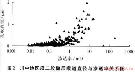 川中及川中-蜀南過渡帶須二段巖石類型主要為長石巖屑砂巖,含少量巖屑砂巖和長石石英砂巖,石英和巖屑含量中等,長石含量相對較高,分別平均為61.45%、1.97%和10.51%;其砂巖孔隙類型主要為粒間、粒內(nèi)溶孔、綠泥石襯邊的溶蝕孔和石英次生加大后的殘余粒間,以及少量雜基孔和微裂縫,面孔率約為10.73%,孔隙結(jié)構(gòu)以中孔細(xì)喉為主,局部發(fā)育小孔細(xì)喉和大孔細(xì)喉型組合。大量須二段巖心壓汞分析統(tǒng)計結(jié)果顯示(圖2),須二段砂巖的孔隙結(jié)構(gòu)非均質(zhì)性較強,喉道直徑分布在0~2μm,變化范圍較大,其中直徑小于0.5μm的微孔喉和小孔喉體積分別占總體積的75%左右,大孔喉發(fā)育較少,并且當(dāng)孔喉直徑小于0.5μm時,滲透率隨孔喉直徑變化呈指數(shù)函數(shù)增長,對滲透率的影響較為敏感。