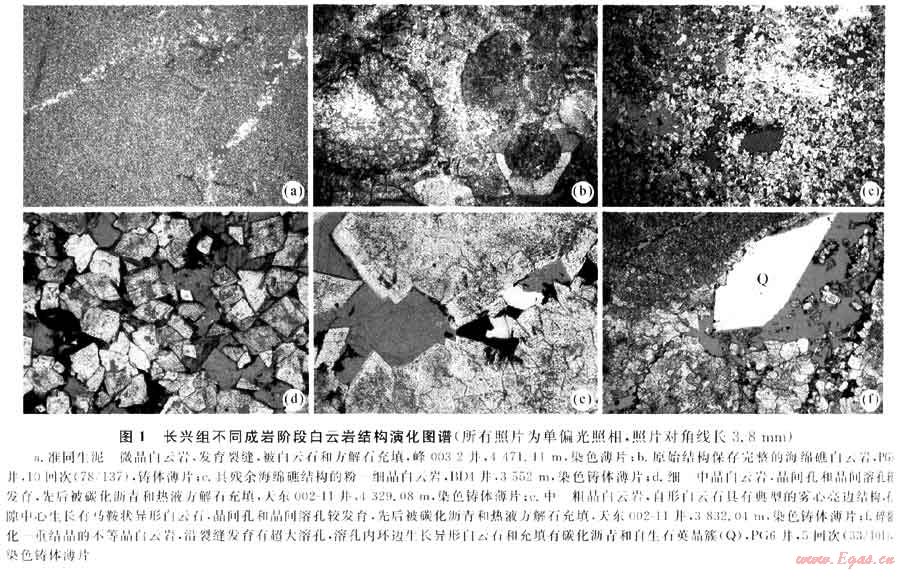 處于埋深1000~4000m的中深埋藏成巖環(huán)境,伴隨沿?cái)嗔褞У构噙M(jìn)入長(zhǎng)興組的熱鹵水成巖流體增量、增溫和增壓,導(dǎo)致更強(qiáng)烈的熱液白云巖化和重結(jié)晶作用,以及相伴隨的溶蝕作用和天青石化、硬石膏化等各類(lèi)次生熱液礦物的沉淀和充填膠結(jié)作用。