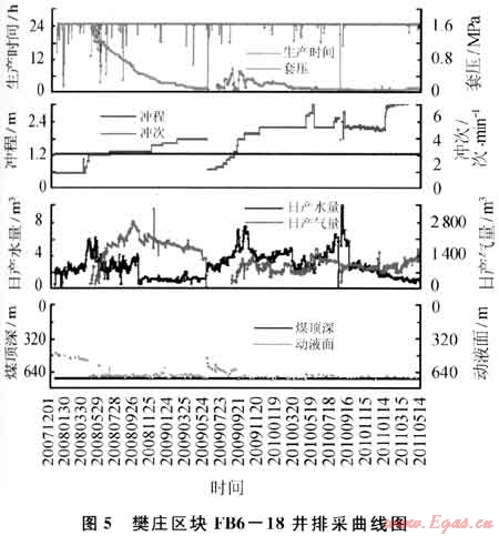 FB6-18井于2007年4月6日完鉆,完鉆井深763m。2007年7月10日壓裂3#煤層,壓裂井段702.8~707.5m,厚度4.7m,共注入活性水壓裂液460m3,石英砂40m3。2007年12月20日投產(chǎn),排采127d解吸見氣,最高日產(chǎn)氣量達(dá)到1555m3,產(chǎn)氣高峰時日產(chǎn)水3.5m3,維持242d后日產(chǎn)氣量迅速下降至696m3,水量1.5m3。判斷為作業(yè)導(dǎo)致煤粉堵塞,或氣鎖,導(dǎo)致難以高產(chǎn)。2009年6月4日進(jìn)行中等規(guī)模壓裂解堵,目前氣量700m3,日產(chǎn)水0.7m3。經(jīng)分析未見效的主要原因該井處于煤層斷層帶附近,煤體結(jié)構(gòu)破碎,煤層堵塞后,難以用壓裂方法解開地層堵塞,只有采取連續(xù)排采,平穩(wěn)降壓的方法,進(jìn)一步擴大解吸范圍,提高產(chǎn)氣量,隨著排采時間的增長,該井產(chǎn)量開始緩慢上升(圖5)。