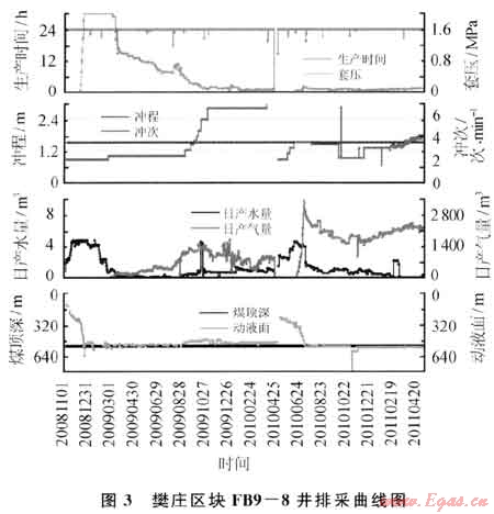 FB9-8井于2006年8月2日完鉆,完鉆井深585m。2008年6月27日壓裂3#煤層,壓裂井段523.8~528.8 m,厚度5.0 m,共注入活性水壓裂液356m3,石英砂30m3。2008年11月7日投產(chǎn),排采40d解吸見氣,最高日產(chǎn)氣量達(dá)到1746m3,產(chǎn)氣高峰時日產(chǎn)水0.8m3,維持138 d后日產(chǎn)氣量迅速下降至466m3,水量0.1m3。判斷為地層氣鎖及地層應(yīng)力閉合雙重影響,導(dǎo)致產(chǎn)量下降(圖3)。2010年5月1日進(jìn)行大規(guī)模壓裂解堵,措施后65d,產(chǎn)氣量增加至2400m3,截至目前已穩(wěn)產(chǎn)312d,累計增產(chǎn)氣約54×104m3。