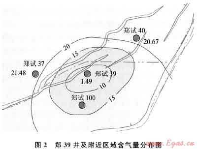 斷層(“陷落柱”)的作用一是對(duì)附近煤層氣有解吸作用,封堵性差可造成煤層含氣量低,但解吸范圍有限,例如鄭試39井位于斷裂帶內(nèi)(圖2),含氣量?jī)H2.5m3/t,主要由于斷層、“陷落柱”煤層氣很快逸散,造成含氣量低;二是近斷層地帶裂縫發(fā)育,通過(guò)壓裂易與斷層、地層水或地表水溝通,煤層氣沿裂縫逸散,排采井可能產(chǎn)水量大、產(chǎn)氣量較小或不產(chǎn)氣[5]。