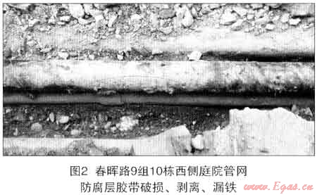 按照SY/T0087—95《鋼質(zhì)管道及儲(chǔ)罐腐蝕與防護(hù)調(diào)查方法標(biāo)準(zhǔn)》,破損缺陷≥8處/1Okm鋼質(zhì)管網(wǎng)評(píng)級(jí)為“差”。在公司長(zhǎng)達(dá)130km埋地鋼質(zhì)管網(wǎng)中,共檢出防腐層破損缺陷303處,超過23處/km,顯然管道防腐層屬“差”的等級(jí)。開挖發(fā)現(xiàn)防腐層缺陷包括以下幾種形態(tài):(1)施工時(shí)未防腐;(2)施工時(shí)創(chuàng)傷(包括點(diǎn)狀和帶狀),此種情形占據(jù)了大部分,觸目驚心(見圖2);(3)防腐層經(jīng)長(zhǎng)時(shí)間浸水起泡;(4)管線彎又、三通、四通等部位防腐施工質(zhì)量差;(5)入戶管線出土處腐蝕較普遍。防腐層缺陷處管道本體腐蝕包括點(diǎn)狀腐蝕和面狀腐蝕,其中以點(diǎn)狀腐蝕危害為重,嚴(yán)重處已穿孔漏氣。