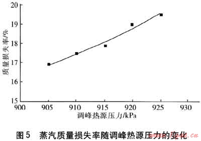 由圖5可知,較低的調(diào)峰熱源出口壓力可以降低蒸汽質(zhì)量損失率。原因在于:當(dāng)調(diào)峰熱源壓力過(guò)高時(shí),部分管段兩端壓差低,導(dǎo)致管內(nèi)蒸汽流動(dòng)過(guò)緩,甚至停滯,大部分蒸汽凝結(jié)成水排出管道。調(diào)峰熱源壓力降低后,存在流動(dòng)過(guò)緩現(xiàn)象的管道數(shù)量減少,蒸汽質(zhì)量損失率減小。因此,在投入調(diào)峰熱源時(shí),壓力若能夠保證用戶(hù)需求,不應(yīng)再提高??稍谡{(diào)峰熱源出口加裝壓力表和壓力傳感器,實(shí)現(xiàn)實(shí)時(shí)監(jiān)測(cè)、調(diào)整。