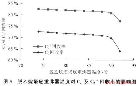 脫乙烷塔底重沸器溫度對(duì)C3及C3+回收率的影響如圖5所示。從圖5可知,隨著脫乙烷塔底重沸器溫度的升高,C3及C3+回收率隨之緩慢下降,但當(dāng)溫度達(dá)到90℃時(shí)回收率會(huì)加速下降。
