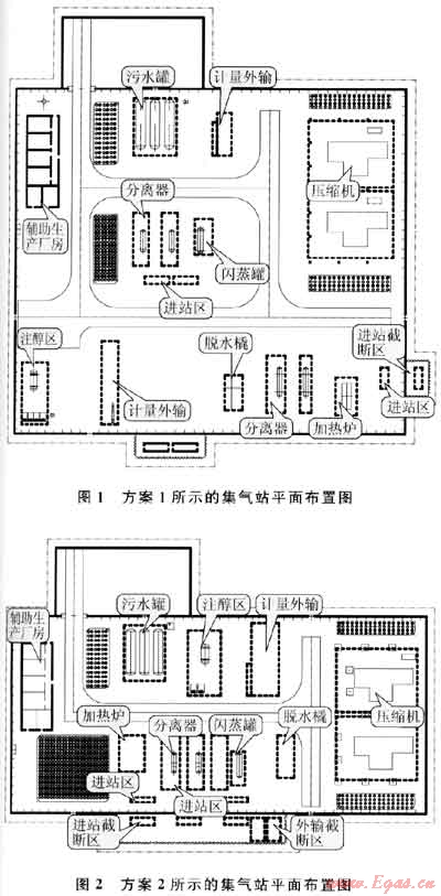 按照確定的集輸流程和主要設備,集氣站的平面布置以蘇里格氣田現在標準化平面布置為基礎,增加上、下古生界氣藏合采氣井集輸流程的設備、配套設備的配管和管網安裝。以蘇東41-3集氣站為例,上古生界氣藏氣井的集輸規(guī)模為50×104m3/d,上、下古生界氣藏合采氣井的集輸規(guī)模為50×104m3/d,該集氣站平面布置做了2個方案進行比選:①方案1,上古生界氣藏氣井的集輸系統平面布置不變,上、下古生界氣藏合采氣井的集輸系統緊靠圍墻重新布置(圖1);②方案2,統籌考慮上古生界氣藏氣井的集輸系統與上、下古生界氣藏合采氣井的集輸系統,按照同類系統靠近布置的原則,重新布置集氣站平面(圖2)。