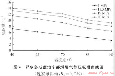 已有研究與實驗表明,煤層氣主要通過范德華力以吸附狀態(tài)存在于煤的內(nèi)表面,等溫條件下,吸附量隨儲層壓力的增大而增大[1~3];然而,煤層氣的吸附量同樣受到儲層溫度的控制,并隨溫度的升高而減少。實際上,煤層在地層條件下對甲烷的吸附能力主要體現(xiàn)為儲層壓力、溫度的雙重作用,即隨埋深增大、儲層壓力增大帶來的煤層氣吸附量增大與儲層溫度升高帶來的煤層氣吸附量減小的綜合作用結(jié)果。