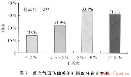 飛一段-飛二段儲層物性普光地區(qū)明顯優(yōu)于元壩地區(qū):普光地區(qū)孔隙度主要介于5%~10%,最大值達(dá)28.86%(圖7),平均值為7.73%,而元壩地區(qū)孔隙度則主要介于2%~5%,最大值為14.15%,平均值為3.12%;元壩地區(qū)65%樣品的滲透率集中分布在小于0.25mD區(qū)間,而普光地區(qū)50%以上樣品的滲透率都大于1mD。