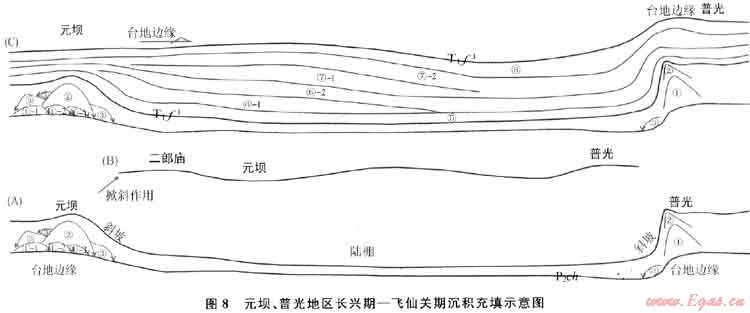 運(yùn)用二維、三維地震資料與鉆井資料相結(jié)合對元壩、普光地區(qū)長興組-飛仙關(guān)組沉積時(shí)期沉積充填模式進(jìn)行了分析(圖8),結(jié)果認(rèn)為:兩地區(qū)長興期沉積主要受早期古地貌控制,元壩地區(qū)長興組沉積早期由臺地沉積逐漸演化為深水沉積,坡度緩(僅3°~5°),斜坡寬,這也就造就了早期生屑灘沉積在一個環(huán)境相似的范圍內(nèi)疊置遷移,灘體發(fā)育面積大,在生物生長過程中逐漸形成最為適合生物生長的位置發(fā)育成為生物礁快速沉積,礁后灘發(fā)育;同時(shí)側(cè)向快速遷移,生物礁分布面積大;而普光地區(qū)長興組沉積早期,臺地-斜坡有明顯的坡折,坡度大(15°左右),適合生物生長的范圍被局限在一定的范圍,礁灘沉積具有垂向加積特征,礁后灘不發(fā)育(圖8)。在地震剖面上元壩地區(qū)發(fā)育前積體,而普光地區(qū)前積體則不發(fā)育。