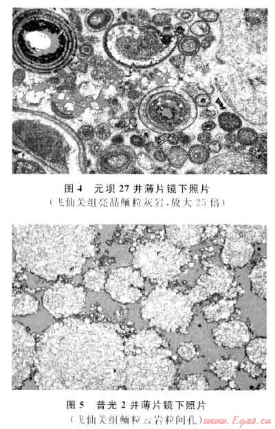 在普光地區(qū)發(fā)育厚層鮞粒灘壩,構(gòu)成普光氣田的主要儲層;而元壩地區(qū)則發(fā)育大片的鮞粒灘,但單層厚度較小,橫向變化快。普光地區(qū)飛一段-飛二段主要由鮞粒云巖、石灰?guī)r組成,飛三段由石灰?guī)r夾膏巖和白云巖組成,儲層主要分布于飛一段-飛二段的鮞粒云巖和粉-細(xì)晶云巖中,儲集厚度大、分布廣、物性好;元壩地區(qū)飛仙關(guān)組以兩個大的向上變淺的旋回為特征,飛一段-飛三段儲層主要分布在飛二段-飛三段的鮞?;?guī)r中,儲集性能總體較差。