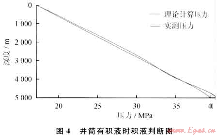 依照該模型,可進(jìn)行該井的壓力計算和積液判斷。7月1日該井井口實測數(shù)據(jù):產(chǎn)油量35.90m3/d,產(chǎn)水量16.63m3/d,產(chǎn)氣量2.83×104m3/d,井底溫度137.27℃,井口壓力17.20MPa,其計算結(jié)果如圖4所示。由圖4可知:計算壓力曲線與實測曲線在井底出現(xiàn)了較大偏差,故判斷井底有積液,由公式(4)計算得積液深度為4774.68m。