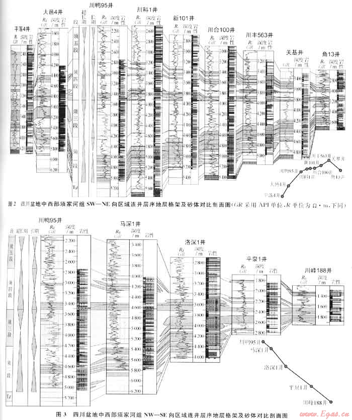 須四段沉積早期,受安縣運(yùn)動影響,在須四段底部普遍發(fā)育砂礫巖沉積,連井地層對比剖面上可見(圖2、3),該時期,不同物源區(qū)砂礫巖體厚度不一,典型如川西坳陷以安縣以南的新場地區(qū)相對較厚,這主要與安縣地區(qū)大幅度隆升剝蝕有關(guān)。受超長期基準(zhǔn)面旋回影響,須上盆水體逐漸加深,須四段中后期至須五段早期,湖盆擴(kuò)張明顯,期間沉積了須四段中上部砂巖,與須二段砂體疊加樣式相似,由川西坳陷中南段湖盆中心向東、向南、向北西斜坡超覆退積,宏觀上依然具有呈階梯狀分布特點,尤其體現(xiàn)在須四上亞段砂體的分布特征上,在川西坳陷中段新場-合興場-豐谷地區(qū),須四段頂部砂體向東階梯狀分布特征已經(jīng)得到三維地震剖面及鉆井的證實,典型如川合100井須四段頂部第一套砂體在以西的新場地區(qū)不發(fā)育,相變?yōu)槟唷5傮w上看這一特點不如須二段清楚,這與龍門山抬升使川西坳陷物源復(fù)雜化有關(guān)。