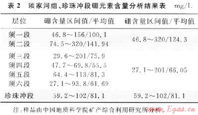 Couch[13]認(rèn)為,沉積物中的硼(B)含量多少與水體鹽度有關(guān),即水體鹽度越高,硼含量就越大,沉積物吸附的硼離子就越多,故硼可以作為指示古水體鹽度的主要標(biāo)志。據(jù)Walker等(1963)研究認(rèn)為黏土礦物中硼含量大于120mg/L為咸水;80~120mg/L為半咸水;小于80mg/L的為淡水。筆者近期對大川中及九龍山地區(qū)須家河組、侏羅系珍珠沖段地層采樣進行了微量元素分析,結(jié)果如表2所示。
