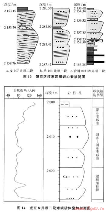 具正粒序的砂體,自然伽馬測井曲線常呈鐘形,往往被解釋為河流砂體,這是導(dǎo)致須家河組解釋為三角洲相的一個基本因素。經(jīng)巖心觀察及微觀研究,具鐘形形態(tài)的砂體除河流體外,另外是風(fēng)暴巖砂體和退積式砂壩(可能類似于羅啟后教授稱的水進河床砂)。退積式砂壩系指當(dāng)湖平面上升速度大于灘壩砂體加積速度時,灘壩砂體退積式沉積,其上部最終演化成湖盆細(xì)粒沉積物的粉砂坪或泥坪,亦可稱之為等效湖進灘壩。與這種退積式灘壩伴生的下部地層多為進積式的灘壩疊加體,而向上為較深水的泥巖(圖14)。