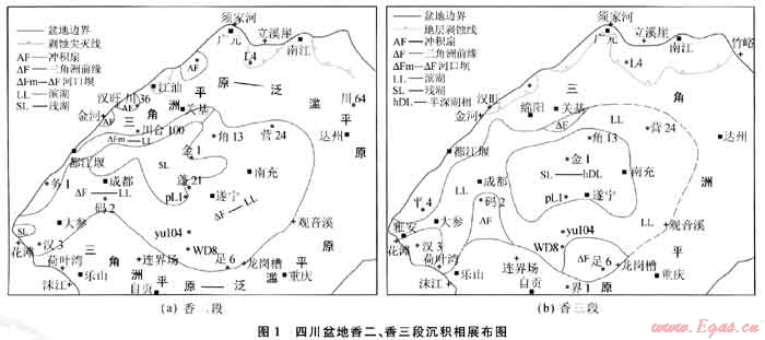 香二段砂巖沉積相的平面展布如圖1-a所示。香四、香六段砂巖的沉積相展布與其類似,從略。