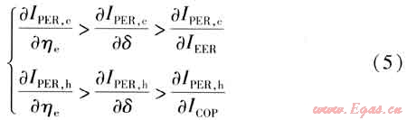 根據(jù)熱泵機組和燃氣機的運行特性可知:燃氣機與壓縮機的傳動效率ηi≈1,一般ηe<0.4,則1>1-ηe>ηe。由于δ<1,一般IEER、ICOP>2,因此IEER-δ>1,ICOP-δ>1。因此有: