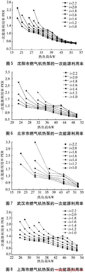 由圖5~8可知:①在供暖季節(jié)使用燃氣機熱泵,若采用單級傳動比,則高傳動比時的一次能源利用率比較低。即傳動比越大,燃氣機熱泵的運行越不經(jīng)濟。②相同傳動比的燃氣機熱泵,其一次能源利用率隨緯度的升高而降低。③熱負荷較小時,低傳動比燃氣機的輸出功率無法滿足壓縮機的功率需求,此時燃氣機會熄火甚至無法啟動。只有通過增大燃氣機的節(jié)氣門開度,提高燃氣機的轉(zhuǎn)速來滿足需要的熱負荷,但此時燃氣機已處于高速低效工作區(qū),機組的經(jīng)濟性較差。④當熱負荷較小時,燃氣機熱泵的一次能源利用率較高,原因是:a.工作環(huán)境改善使熱泵的供熱系數(shù)比較高;b.當熱負荷較小、燃氣機轉(zhuǎn)速較低時,供熱量中回收的燃氣機余熱比例較大;c.當熱負荷最大時,燃氣機熱泵在4個城市中的一次能源利用率都比較低,約為0.6~0.8,但這種惡劣極端天氣的時間在供暖期中所占的比例很小。d.在熱負荷為30~40kW(供暖時間比較集中)時,采用不同單級傳動比的燃氣機熱泵,其一次能源利用率較高,基本都大于1.2。