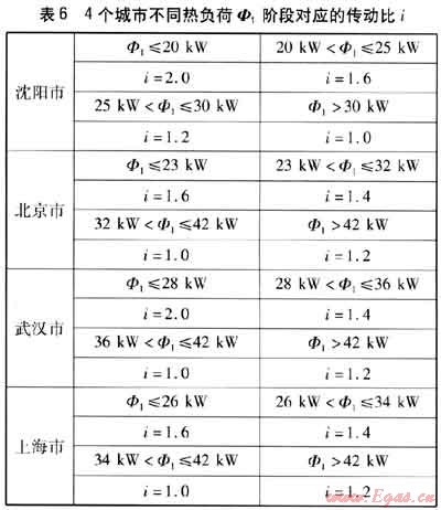 遵循多級傳動比的確定原則,結(jié)合單級傳動比的計算結(jié)果,針對4個城市的不同熱負荷階段,確定了采用多級傳動比的燃氣機熱泵的不同傳動比i(即檔位),見表6。
