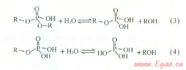 有機(jī)酯的水解反應(yīng)為?;忌系挠H核取代,羧酸酯水解反應(yīng)方程式為式(1)[11],產(chǎn)物為羧酸和飽和醇;磷酸酯水解反應(yīng)方程式為式(2)~(4),產(chǎn)物為磷酸和飽和醇??梢?,有機(jī)酯水解后產(chǎn)物為有機(jī)酸和醇類物質(zhì)。由于有機(jī)酸為酸化常用體系,有助于酸化,同時(shí)醇類物質(zhì)具有較好的潤(rùn)濕延展性,能降低表面張力。因此,有機(jī)酯不僅不會(huì)對(duì)儲(chǔ)層造成傷害,其水解產(chǎn)物有機(jī)酸還能起到一定的酸化效果,醇類還能解除水鎖現(xiàn)象。