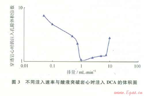選用滲透率為5~120 mD的石灰?guī)r巖心,以某一恒定的流量注入DCA就地自轉(zhuǎn)向酸,計量酸液穿透巖心的酸液體積(孔隙體積的倍數(shù))。得到以碳酸鹽巖心注酸流量為自變量時,蚓孔突破巖心需要酸液量占孔隙體積的倍數(shù)(PV)。圖3給出了滲透率范圍為5~120 mD的石灰?guī)r巖心以不同流量下注入DCA自轉(zhuǎn)向酸突破時的注入酸液孔隙體積倍數(shù)。實驗結(jié)果表明:①注入DCA體系表現(xiàn)出突破孔隙體積與注酸流量存在一定關(guān)系;②注酸速率在0.05~1.0mL/min范圍,隨著注酸速率增大,穿透巖心所需的DCA酸液體積減少;③注酸速率在1.0~7.5mL/min范圍,隨著注酸速率增大,穿透巖心所需的DCA酸液體積呈增加趨勢,但增加幅度不大;④注酸速率在7.5~10.0mL/min范圍,隨著注酸速率增大,穿透巖心所需的DCA酸液體積大幅度增加;⑤最佳的注酸流量為1mL/min,酸液突破最小注酸體積倍數(shù)為1.2 PV。