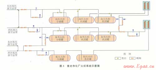 放空管網系統(tǒng)包括從各系列天然氣凈化裝置內的放空閥后至高低壓放空分液罐的部分。每系列裝置管廊上的高低壓放空總管經位于裝置界區(qū)的高低壓分液罐分離泄放氣中攜帶的脫硫、脫水溶劑后,匯入東西區(qū)高低壓放空管網。東區(qū)高低壓放空管網主要負責第一、二、三聯(lián)合天然氣凈化裝置、趙家壩污水站及集氣總站的放空需要,西區(qū)高低壓火炬放空管網主要負責第四、五、六聯(lián)合天然氣凈化裝置的放空需要。東西區(qū)高壓放空管網并行進入高壓放空分液系統(tǒng),東西區(qū)低壓放空管網匯合成低壓放空總管后進入低壓放空分液系統(tǒng)。