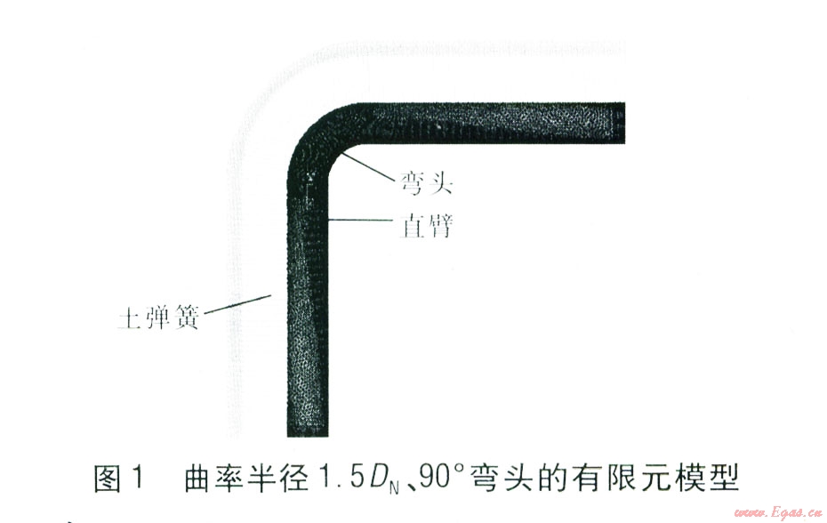 在Pro/Engineer軟件中建立橢圓彎頭模型,并通過數(shù)據(jù)無縫連接的方法將模型導(dǎo)入ANSYS軟件中。在ANSYS軟件中對(duì)彎頭進(jìn)行網(wǎng)格劃分,并施加彈簧一阻尼器單元,然后設(shè)置彎頭和土彈簧的參數(shù),再施加荷載進(jìn)行求解。對(duì)彎頭的應(yīng)力有限元求解采用第四強(qiáng)度理論(形狀改變比能理論),第四強(qiáng)度理論認(rèn)為形狀改變比能是引起材料屈服破壞的主要因素,無論何種應(yīng)力狀態(tài),只要構(gòu)件內(nèi)一點(diǎn)處的形狀改變比能達(dá)到單向應(yīng)力狀態(tài)下的極限,材料就要發(fā)生屈服破壞。由米塞斯(Mises)公式[8]65計(jì)算當(dāng)量應(yīng)力。考慮到彎頭兩端直臂過長易降低軟件的運(yùn)算速度,因此建模時(shí)彎頭兩端直臂長度只取5 m,熱伸長量均由位移荷載代替,將位移荷載施加到直臂兩端面上。采用20節(jié)點(diǎn)的Solid95實(shí)體單元?jiǎng)澐謴濐^與直臂,彈簧-阻尼器單元COMBINl4用于模擬管-土相互作用下的土彈簧[10],對(duì)彎頭和直臂全部采用自由劃分后形成的網(wǎng)格方式[10]。曲率半徑1.5DN(DN為公稱直徑)、90。彎頭的有限元模型見圖1。