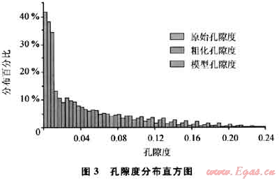 2) 統(tǒng)計特征對比。對比建立的孔隙度、滲透率、含氣飽和度等儲層參數(shù)的模型統(tǒng)計特征和輸入的原始測井解釋數(shù)據(jù)及其粗化后的數(shù)據(jù)(圖3),可以看出地質(zhì)模型儲層參數(shù)與原始數(shù)據(jù)的統(tǒng)計分布特征基本一致。