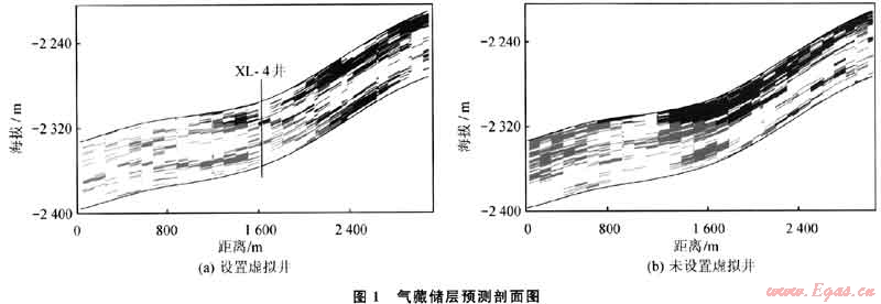 研究結(jié)果表明,根據(jù)地震資料結(jié)合鉆井及地質(zhì)綜合研究構(gòu)建合理“虛擬井”可以有效地解決氣藏邊部井網(wǎng)稀疏區(qū)域井間隨機性強的缺點,能夠進(jìn)一步提高儲層地質(zhì)模型的精度。將采用和不采用“虛擬井”技術(shù)建立的儲層分布模型進(jìn)行對比可以看出,其儲層的發(fā)育程度和在空間上出現(xiàn)的位置具有很大的不同(圖1),表明僅依靠地震儲層反演成果約束建立的地質(zhì)模型在邊部井網(wǎng)稀疏的地方不能反映薄儲層在縱橫向上分布的特征。