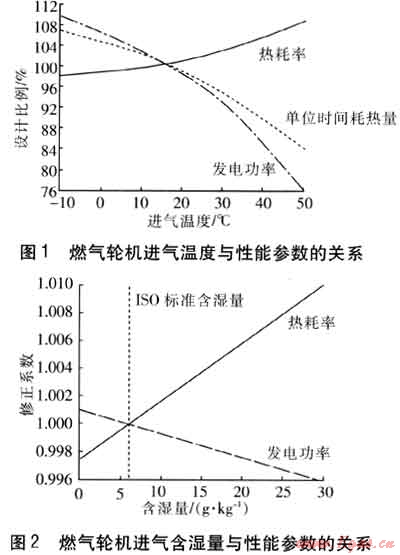 PG6111FA型燃?xì)廨啓C(jī)發(fā)電機(jī)組的標(biāo)準(zhǔn)工況(額定工況)為:環(huán)境溫度為15℃,大氣絕對壓力為97.8kPa、相對濕度為48%(即含濕量為5.25g/kg)。在標(biāo)準(zhǔn)工況下,該燃?xì)廨啓C(jī)發(fā)電功率為73640kW,單位時間耗熱量為750.4×106kJ/h,熱耗率(指每生產(chǎn)1kW·h電所消耗的熱量)為10190kJ/(kW·h),排氣質(zhì)量流量為735.3×103kg/h,排氣溫度為600.6℃,燃料是天然氣。在非標(biāo)準(zhǔn)工況下(環(huán)境相對濕度為48%,大氣絕對壓力為97.8kPa),燃?xì)廨啓C(jī)進(jìn)氣溫度與性能參數(shù)的關(guān)系見圖1,圖1中設(shè)計比例是指燃?xì)廨啓C(jī)非標(biāo)準(zhǔn)工況下的性能參數(shù)與標(biāo)準(zhǔn)工況下的性能參數(shù)之比。在環(huán)境溫度為15℃、大氣壓力為97.8kPa時,燃?xì)廨啓C(jī)空氣進(jìn)氣含濕量與性能參數(shù)的關(guān)系見圖2,圖2中含濕量是每1kg干空氣中含有水的質(zhì)量,修正系數(shù)是指非IS0標(biāo)準(zhǔn)空氣進(jìn)氣含濕量時燃?xì)廨啓C(jī)的性能參數(shù)與IS0標(biāo)準(zhǔn)空氣進(jìn)氣含濕量下燃?xì)廨啓C(jī)的性能參數(shù)之比。