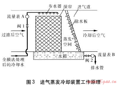 進(jìn)氣蒸發(fā)冷卻裝置工作原理見圖3。它由濕簾、布水器、除水板、水箱及一些附屬設(shè)備組成。其工作原理是:經(jīng)全膜法處理后的冷卻水經(jīng)閥1調(diào)節(jié)送至濕簾頂部的布水器后均勻地灑在濕簾表面,由于重力作用冷卻水自上往下如水簾灑下??諝馐紫冉?jīng)過濾器過濾,除去雜質(zhì),然后再進(jìn)入蒸發(fā)冷卻裝置,與濕簾中自上而下的冷卻水進(jìn)行熱濕交換。部分水因吸收空氣的顯熱汽化蒸發(fā)后變成水蒸氣,未蒸發(fā)的水流回水箱,排出后用于其他用途??諝庖蚴ワ@熱而溫度降低,同時因融進(jìn)了部分水蒸氣而使其相對濕度增加??諝馀c水蒸氣的混合物流向下游的除水板,其中的小水滴和部分水霧在除水板上凝結(jié)成大水滴,并在重力的作用下落入水箱,降低了進(jìn)氣的攜水率,減少了壓氣機(jī)因進(jìn)氣空氣水量增加而導(dǎo)致的負(fù)荷消耗;同時空氣中的微小塵埃也隨水滴落入水箱,淋灑下來的冷卻水對空氣還起到了水洗除塵的輔助效果,避免了進(jìn)氣中的微量雜質(zhì)對燃?xì)廨啓C(jī)葉片的腐蝕。