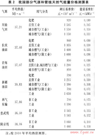 目前,我國天然氣出廠價格實行“政府指導(dǎo)價”,分生產(chǎn)區(qū)域制訂分用戶類型(化肥用氣、工業(yè)用氣和城市燃氣)的結(jié)構(gòu)氣價。根據(jù)國家發(fā)展和改革委員會2010年6月調(diào)整0.23元/m3后的天然氣出廠價測算的能量基準價格參見表2??梢钥闯?,受各氣田天然氣發(fā)熱量差異和價格水平差異影響,價格形式轉(zhuǎn)換后,各地區(qū)能量價格水平差別較大。