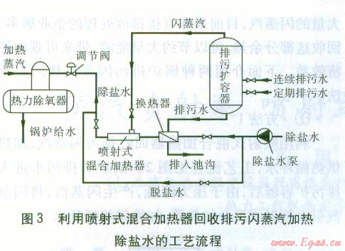 利用噴射式混合加熱器回收排污閃蒸汽,加熱除鹽水[7],工藝流程見圖3。在排污擴容器內(nèi)閃蒸降壓后的排污水,經(jīng)換熱器與除鹽水換熱,閃蒸汽通過噴射式混合加熱器再次加熱除鹽水。加熱后的除鹽水,進入熱力除氧器除氧后作為鍋爐供水。