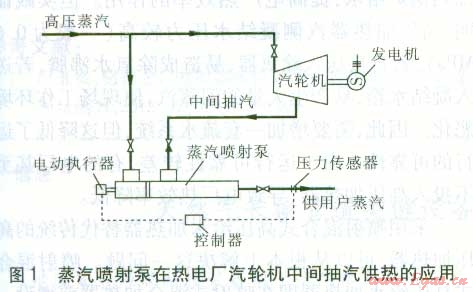 在工業(yè)生產(chǎn)過程中,不同的工藝過程往往需要不同壓力的蒸汽,而熱電廠、鍋爐房供應的蒸汽壓力通常比較單一。傳統(tǒng)方法是通過蒸汽的減溫減壓,滿足熱用戶對蒸汽參數(shù)的要求。但是,這種方式易造成蒸汽品位的降低。蒸汽壓力匹配技術就是為滿足熱用戶對蒸汽不同壓力等級需求而開發(fā)的技術,它在實現(xiàn)節(jié)能的同時合理利用蒸汽裕壓,通過蒸汽噴射泵利用高壓蒸汽引射低壓蒸汽,在降低高壓蒸汽壓力的同時提高低壓蒸汽的壓力。通過設備的結構設計和蒸汽流量調節(jié),產(chǎn)生介于高、低壓蒸汽壓力之間的各種壓力的蒸汽,滿足用戶的要求。蒸汽噴射泵在熱電廠汽輪機中間抽汽供熱的應用見圖l。鍋爐供應的高壓蒸汽進入蒸汽噴射泵,通過引射作用,將汽輪機中間抽汽(低壓蒸汽)吸人蒸汽噴射泵,最后向用戶供應一定壓力的蒸汽。由壓力傳感器、控制器、電動執(zhí)行器組成的自動控制系統(tǒng),通過測量蒸汽噴射泵出口蒸汽壓力的變化,調節(jié)進入蒸汽噴射泵的高壓蒸汽流量,保持蒸汽噴射泵出口蒸汽壓力的穩(wěn)定,滿足用戶對蒸汽壓力的需要。